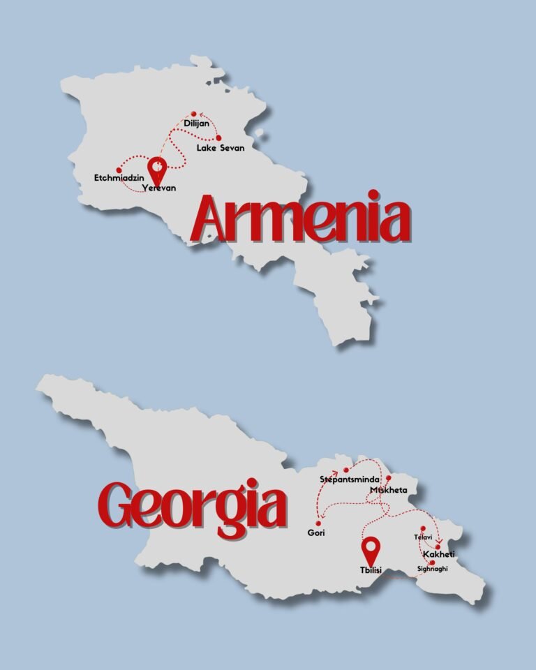 From August 17th – 28th, 2026, we’re taking you on an unforgettable journey through Armenia & Georgia, where history, culture, and stunning nature are waiting for you. From the vibrant streets of Tbilisi and Yerevan to the serene beauty of Lake Sevan, to the medieval architecture in the Caucasus mountains, this tour is designed to immerse you in the best of both countries. Experience beautiful monasteries, charming old towns, authentic local cuisine, and the legendary hospitality of the Caucasus.